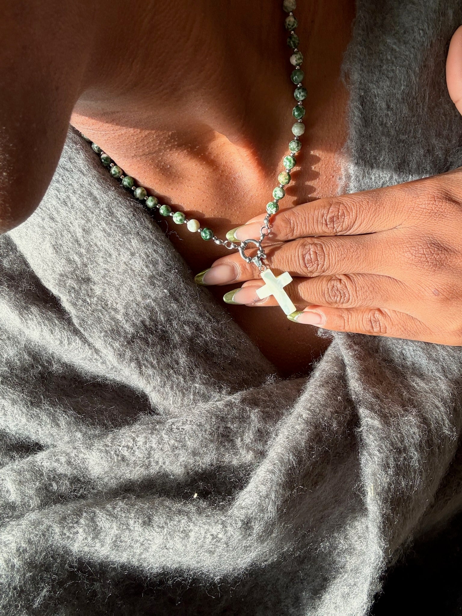 Hecho a mano 40cm de piedras naturales y cierre versátil pudiendo usar de diversas formas y pigente de cruz extraíble.
