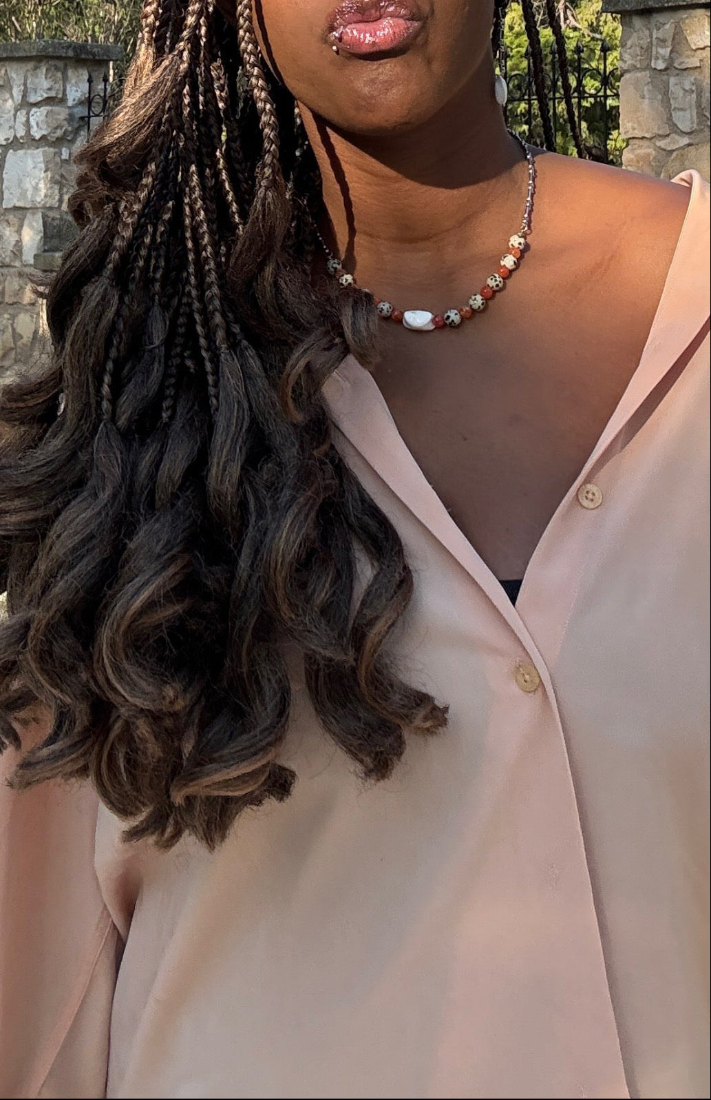 Collar con piedras naturales de jaspe dálmata y ágata de fuego con la mitad en acero inoxidable cadena de plata.