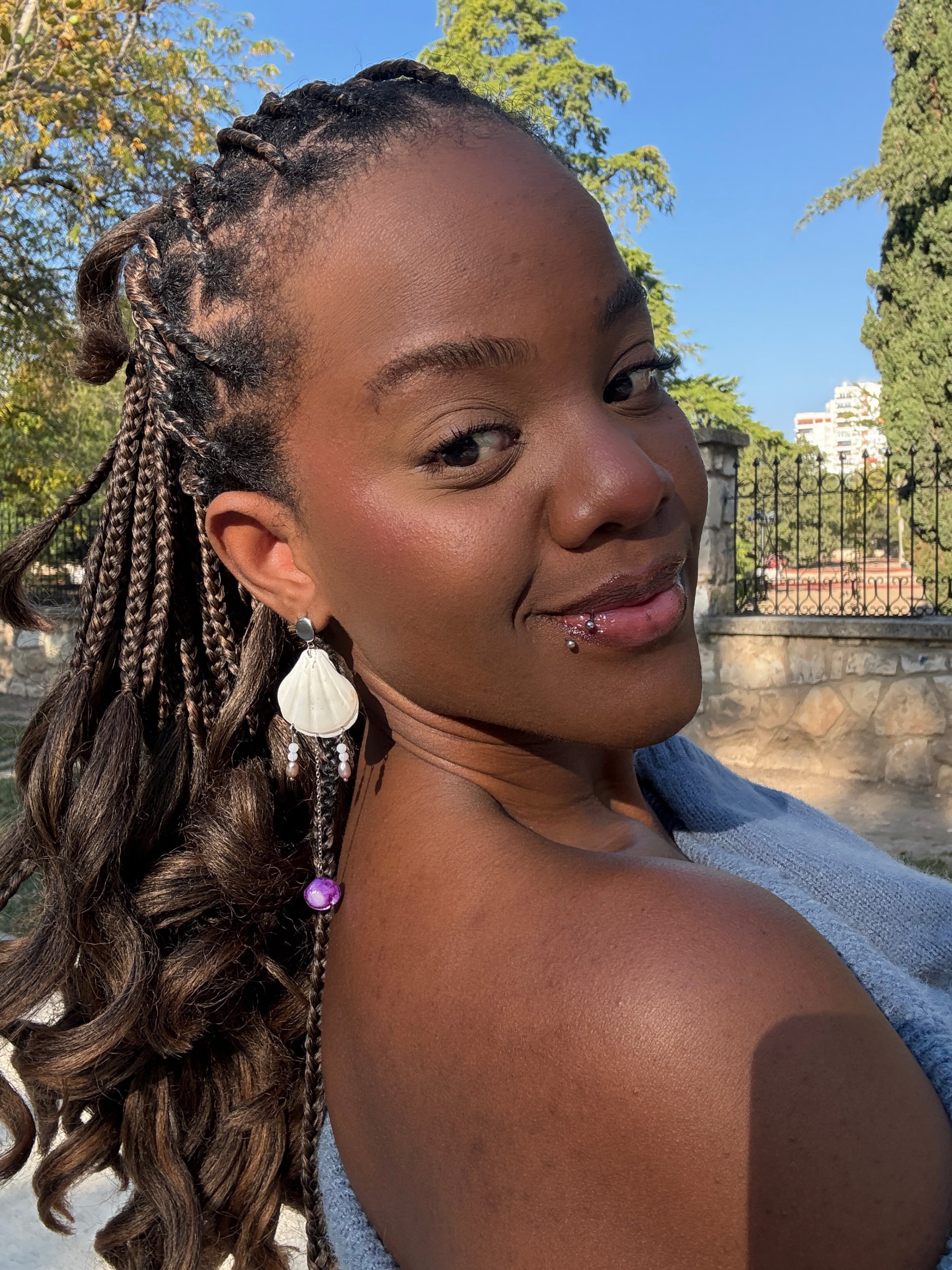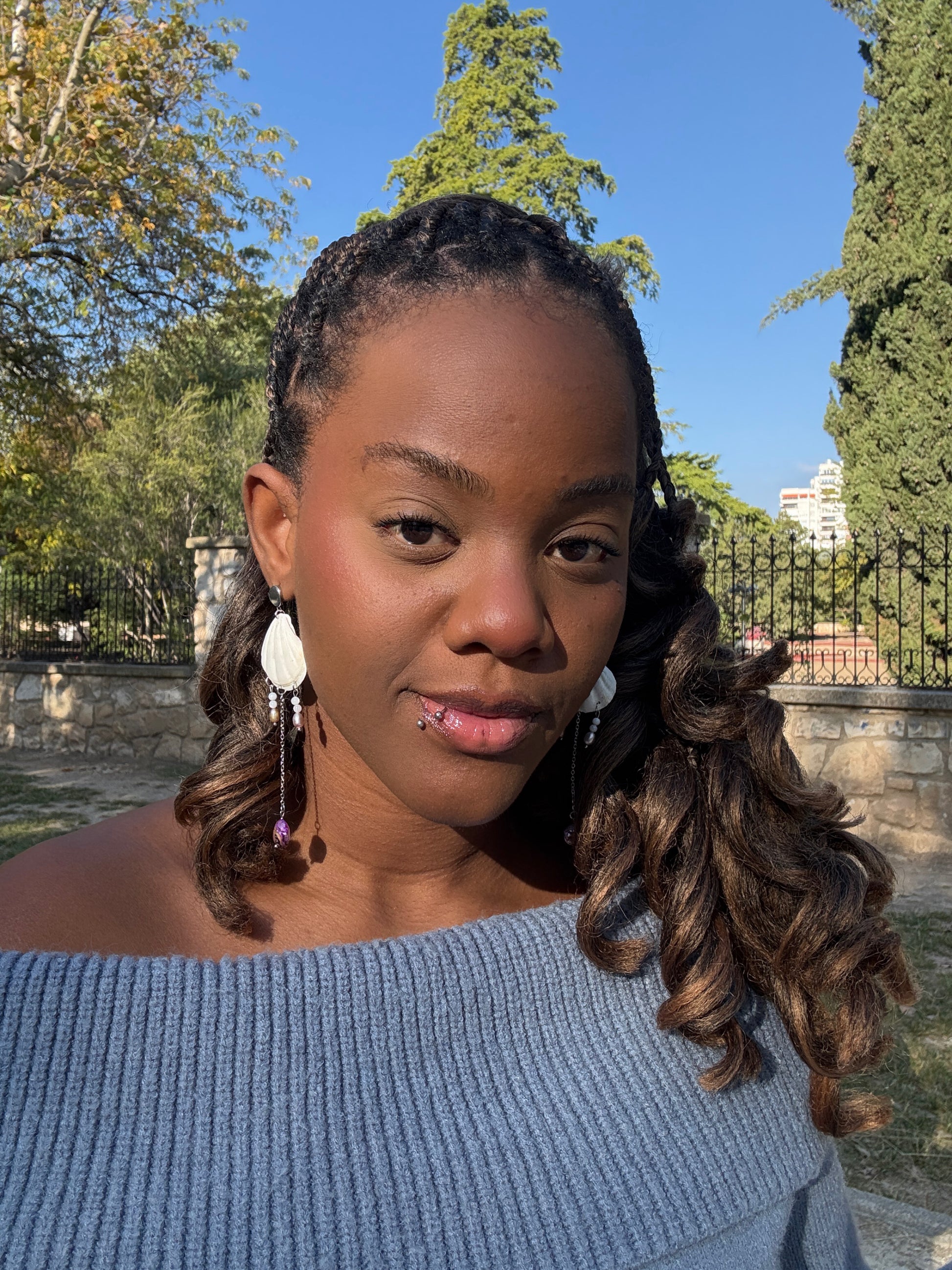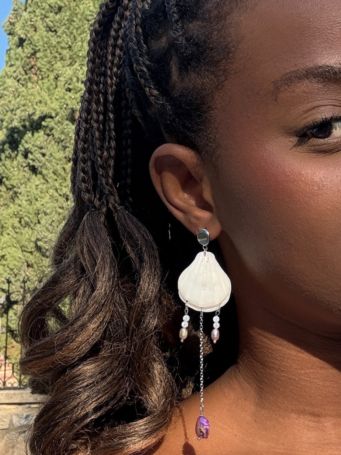 Hecho de piedra natural y concha del mar, con detalles en amatista este arete es perfecto para combinar con tu día a día.